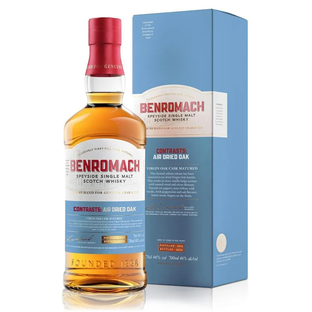 Whisky Benromach Virgin Oak Air Dried 2012 là phiên bản giới hạn đặc biệt của nhà máy rượu Benromach, đã được ủ trong thùng gỗ sồi Virgin Oak phơi khô bằng không khí. Điều này tạo ra hương thơm ngọt ngào của kẹo mềm vani với ngũ cốc nướng và hoa cam quýt. Tiếp theo là hương vị êm dịu nhưng cay nồng, với hương vani, bạc hà tươi và gỗ sồi. Khói tinh tế đọng lại ở phần kết thúc.