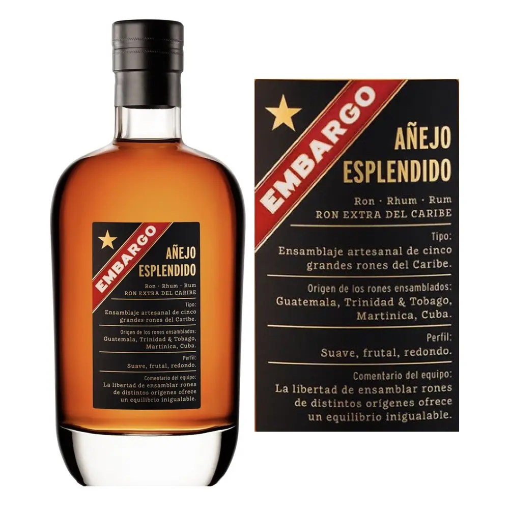 Embargo Anejo Esplendido là một loại rượu mạnh được làm từ nước mía lên men với hương thơm đặc biệt và êm dịu, rất thích hợp để nhâm nhi hoặc pha chế trong các loại cocktail. Chai rượu thuộc sở hữu của Les Bienheureux là một công ty Pháp với tốc độ tăng trưởng 40% mỗi năm