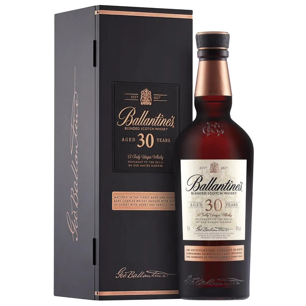 Blended lần đầu tiên trong năm 1930, Ballantine’s 30 là một whisky có uy tín vẫn không thay đổi trong hơn 85 năm. Công thức này được canh gác chặt chẽ và cẩn thận đưa ra từ mỗi máy xay sinh tố tổng thể kế nhiệm ông.