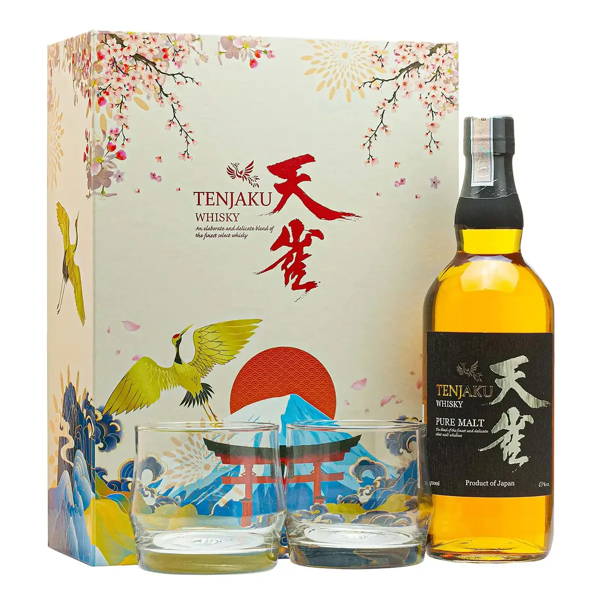 Tenjaku Pure Malt Hộp Quà Tết 2026 bao gồm rượu Tenjaku Pure Malt, 2 ly rock uống whisky, túi xách đi kèm và mẫu hộp được thiết kế, phát hành giới hạn cho dịp tết Nguyên Đán Bính Ngọ 2026. Màu sắc chủ đạo của Tenjaku Pure Malt Hộp quà Tết 2026 là màu trắng phối đỏ với họa tiết đậm nét Nhật Bản như núi Phú Sĩ, mặt tròn mọc, hoa anh đào và con hạc, mang đến sự may mắn và thịnh vượng cho gia chủ.